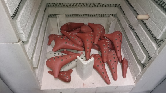 素焼なので、重ねても大丈夫なのですが、重くなりすぎて一番下が割れたら崩れて他の管もダメージをうけそうなので、棚板を使って、丁寧にセッティング。