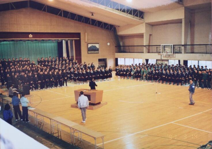 ▼旧校舎時代から今でもおこなわれている斐川西中学校伝統の卒業式での全校合唱の写真