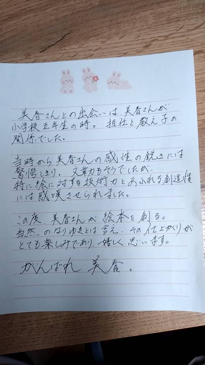 この度、美春さんが絵本を創る。当然のなりゆきとは言え、その仕上がりがとても楽しみであり、嬉しく思います。
