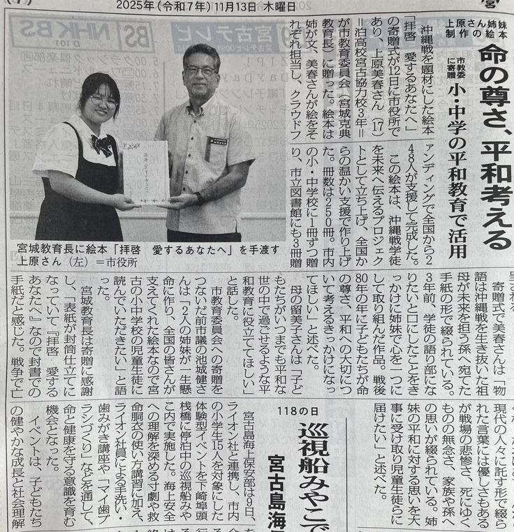 昨日、宮古島市教育委員会の教育長を表敬訪問し、絵本『拝啓 愛するあなたへ』(文・絵 上原姉妹)の贈呈式を開いていただきました。