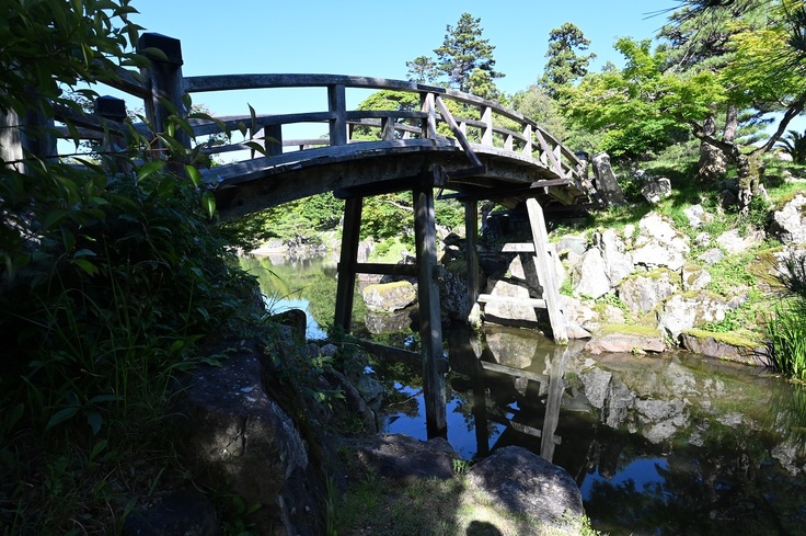 継続的にさまざまな修理・整備が必要な彦根城ですが、本年度は玄宮園の池に浮かぶ中島「蘇鉄山」と茶屋「鳳翔台」を結ぶ木橋「高橋(たかばし)」の架け替えに新たに着手します。