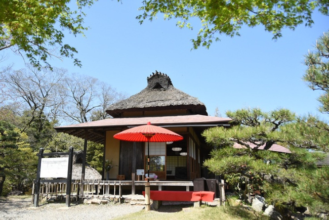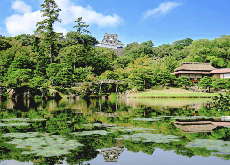 かつては琵琶湖の松原内湖が庭園のすぐ北側まで広がっていました。その水が豊かな場所を活かし、大規模な池泉回遊式を採ったのが「玄宮園」です。池や築山、中島、茶屋が巧みに配され、水面には天守が映り込む幻想的な眺めが広がります。彦根城と一体となった景観が現存している点でも、貴重な庭園と呼べるでしょう。