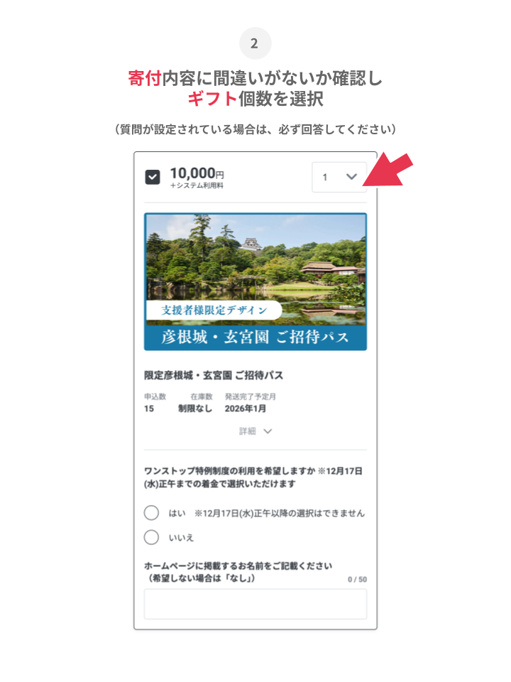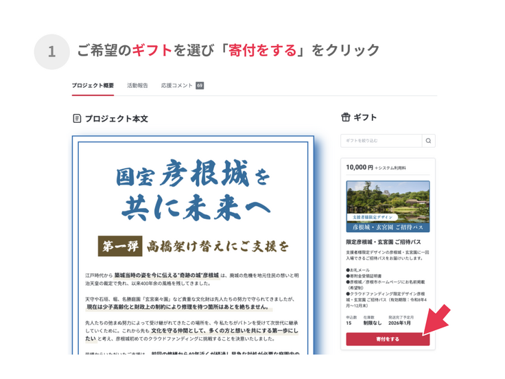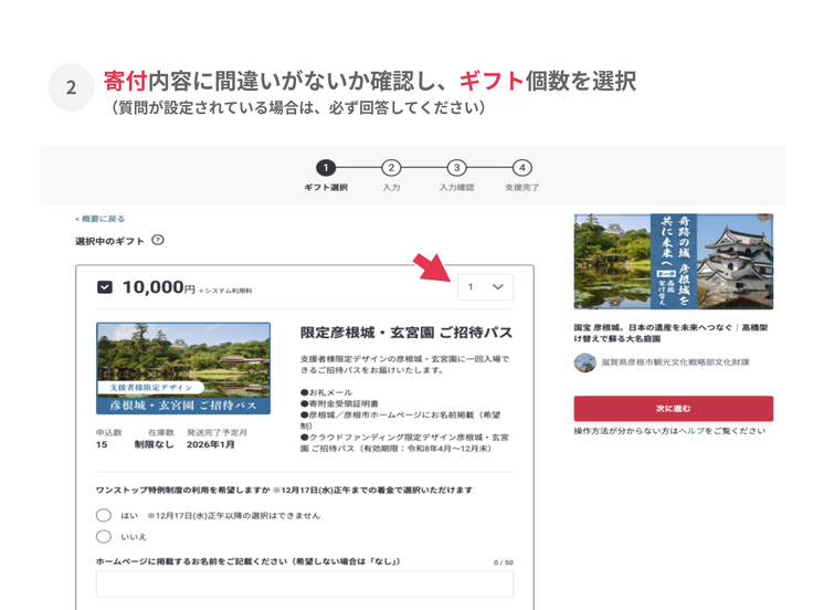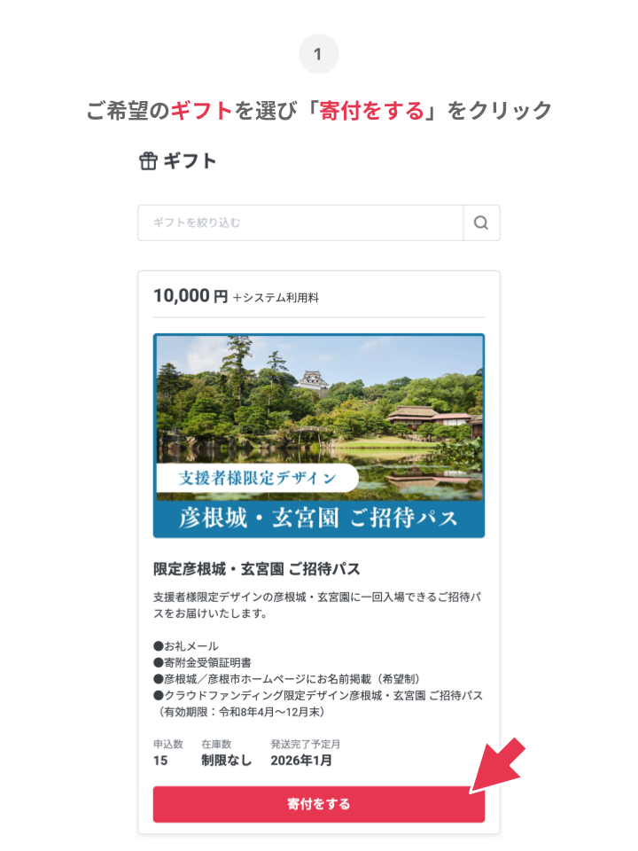 支援者様限定デザインの彦根城・玄宮園に一回入場できるご招待パスをお届けいたします。