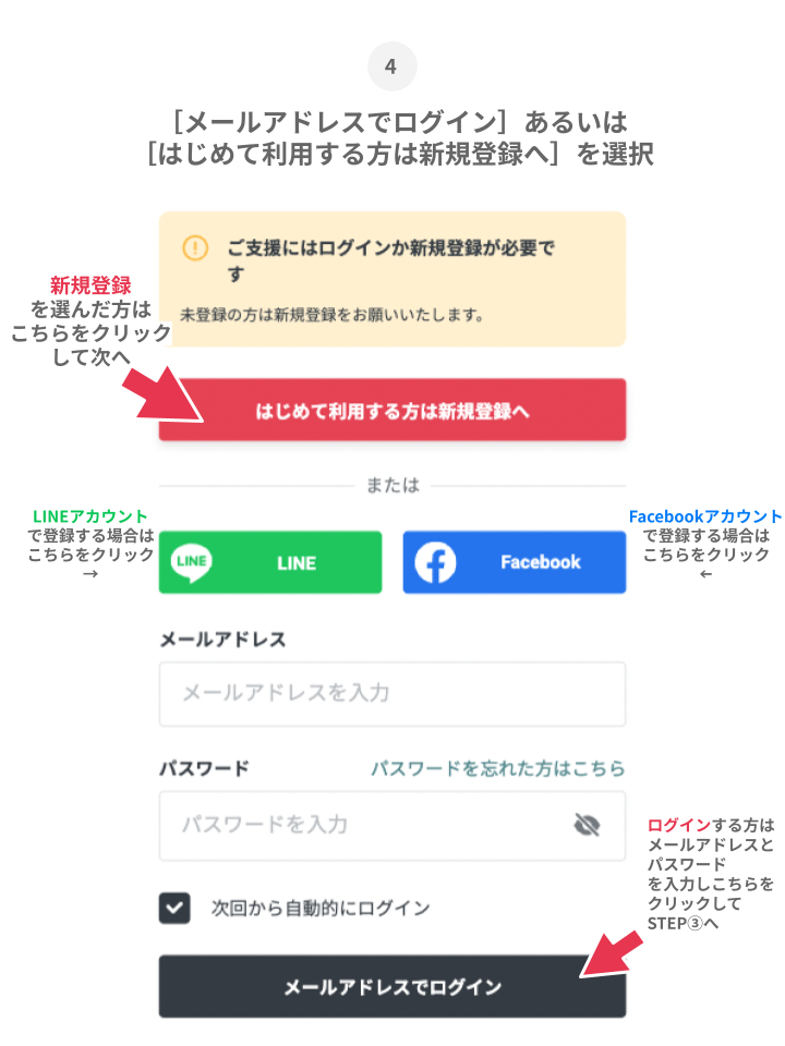 ※途中で新規登録を行う場合は、再度手順1から操作となるため、先にアカウント作成をお願いいたします。