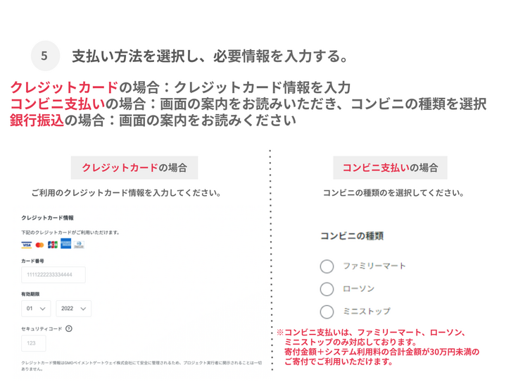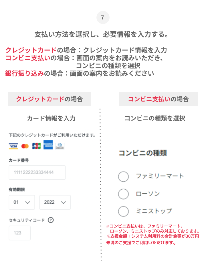 ご支援について、ご利用のスマートフォンまたはパソコン環境と、ご支援の方法に合わせて流れを作成しております。操作方法がわからない方はご確認いただけましたら幸いです。