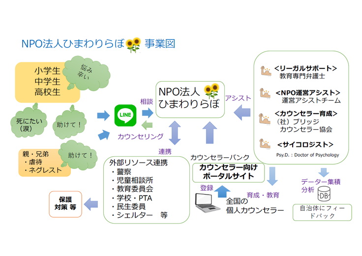 ひまわりらぼは、いじめや虐待・ネグレクトなどに悩む子ども達に、24時間365日SNSアプリを使用した無料カウンセリングを行う事業を運営する。