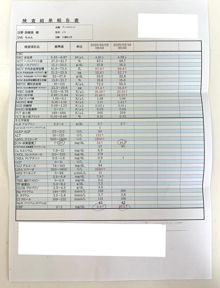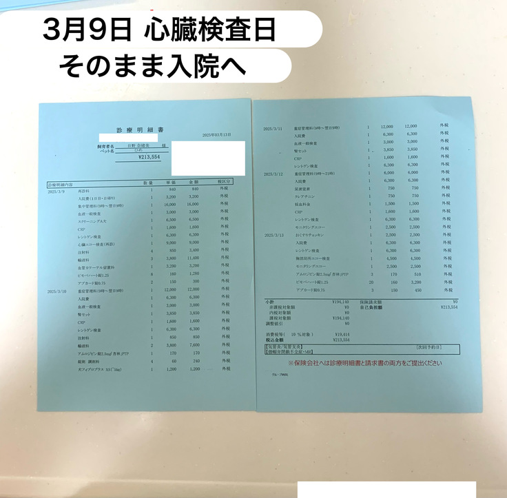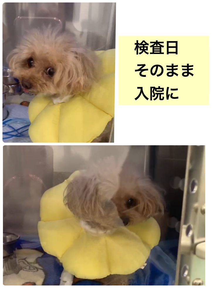 検査当日、午前中に預け夕方にお迎えの予定でしたが、昼に病院から電話があり入院した方がいいとの事。
