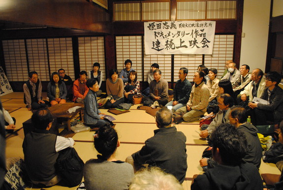 (熱気あふれる第1回上映会の様子。民映研理事の中川誼美氏をゲストに迎えて)