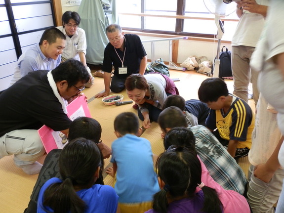 (「沙流川アイヌ・子どもの遊び」高柳上映会で、モンゴルの留学生から、羊の骨で作った伝統のサイコロ遊びを教えてもらっている小学生達。)