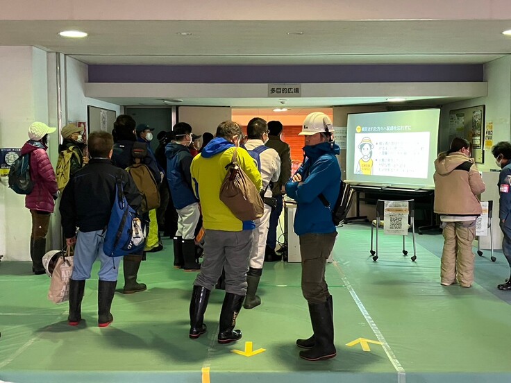 運営スタッフのミーティングの後は、HPから事前にボランティア活動仮登録をして下さったボランティアの方々が災害ボランティアセンターにやってきます。受付が済んだボランティアの方には、注意事項をまとめた短い動画を見ていただいています。