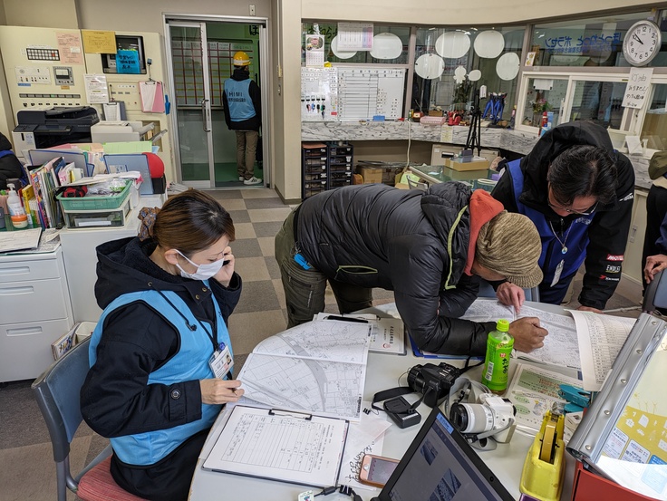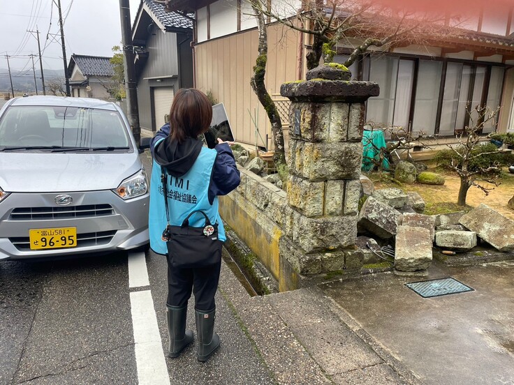 同時に、氷見市社会福祉協議会職員が手分けして、前日までに依頼があった場所を訪問し、現地への訪問調査をしています。依頼いただいた内容や、必要なボランティアの人数、資材、ボランティア以外にも必要な支援が無いか等、依頼された方とお話ししています。併せて、依頼いただいたお家だけでなく、近隣のお家にも災害ボランティアセンターを紹介したり、周辺の状況等も確認します。