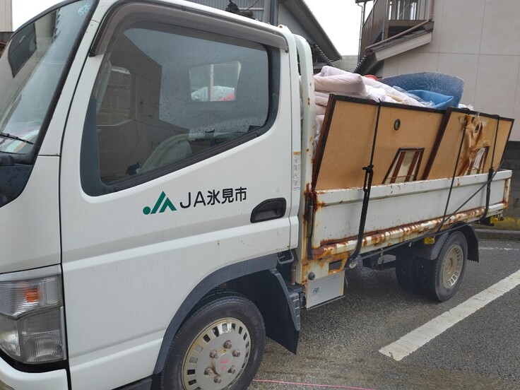 軽トラ2台(富山ダイハツ販売株式会社提供)、2tトラック1台&2tダンプ1台(JA氷見市提供)が連日大活躍です。
