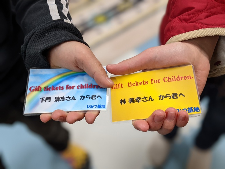 子ども食堂ひみつ基地では、小中学生を対象に無料で食事を食べることができます。その代金の肩代わりをするのが、みらいチケットの仕組み。オトナがあらかじめ無料食券を購入して、その無料食券(みらいチケット)を子どもたちが利用するシステム。
