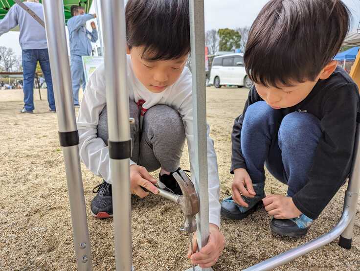 過去に何度か物販ブース体験で設営を経験している子どもたち。めちゃくちゃ手際が良くあっという間にブースが完成。