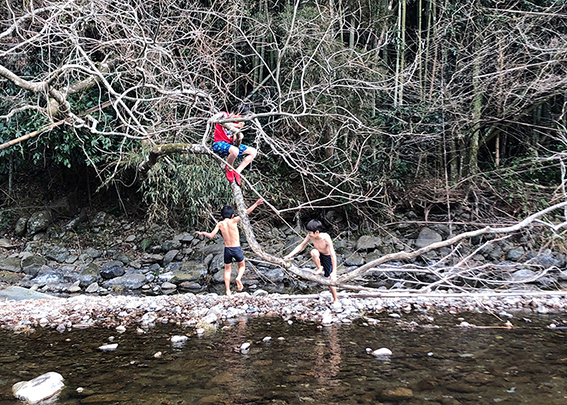 子どもたちは、真冬でも川で泳いでみたり、河原の石を立ててみたり、釣りをしたり(冬はあまり釣れないようです。)ゆっくりゴロゴロしたり、鬼ごっこやかくれんぼをしたり、スラックラインではしゃいでみたり、( たまに森を整備しながら )食物連鎖や自然の循環を体感したり、次にみんなでやってみたいことを話し合ったり、学んだり。そしてケンカしたり・・・。
