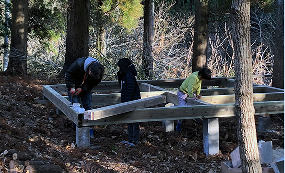 ひめちゃん(←超人気の大工さん)指導のもと子どもたちやスタッフと手作りのウッドデッキも土木から挑戦しました。