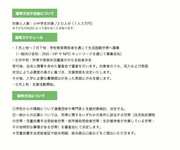 ・適切に20名を決定できる理由:子どもの貧困が専門の宮崎大学院教授、県教育委員会とのケース会議、また学習支援団体等からの相談が、必須となる予定です。