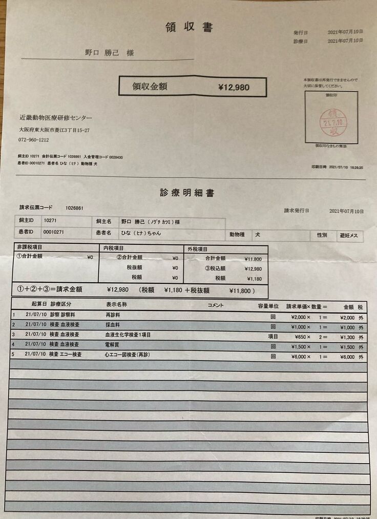 2021年7月10日 近畿動物医療研修センター付属動物病院にて再度検査を行い、手術は10月14日に決まりました。10月13日入院です。
