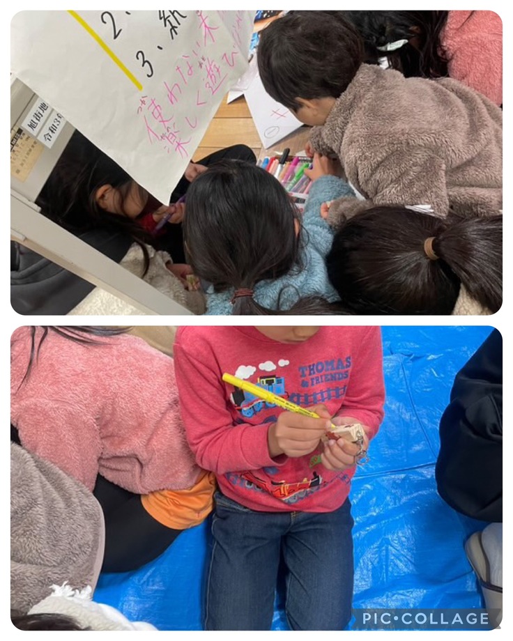 子どもたちは、木の素材にペンで書いたり、スパンコールやシールを貼り付けたりして思い思いに自分だけの作品を作り上げます。