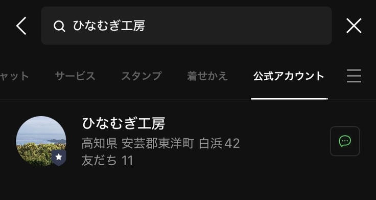 認証アカウントとなったことで、「ひなむぎ工房」で検索をするだけでラインアカウントの検索が可能になりました。