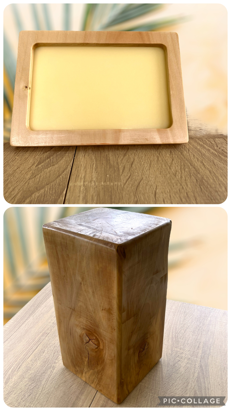 写真上はイチョウの一枚板からつくったフォトフレームです。色合いが美しい