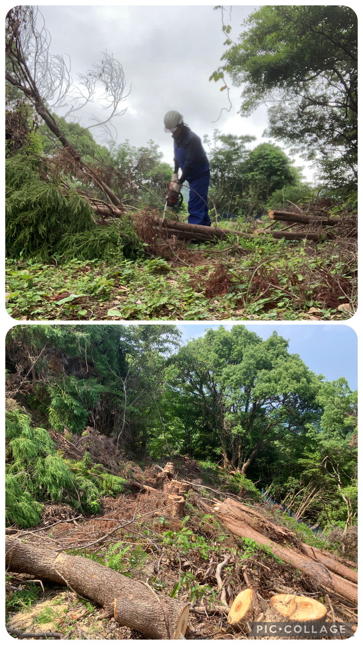 ④ひなむぎの森では、引き続き地拵えを行なっています。切れば切るほど日陰がなくなっていき、切ることよりも片付けが大変ですが、なんとか進めています。暑いけど、7月に少しは植え付けができるようにと頑張っています。
