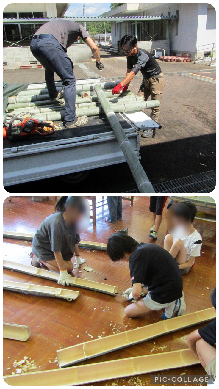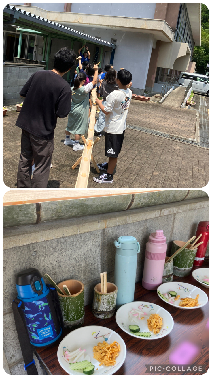 ↓ 7/15(火)に地元甲浦小学校にて、流しそうめん体験に講師として参加してきました。