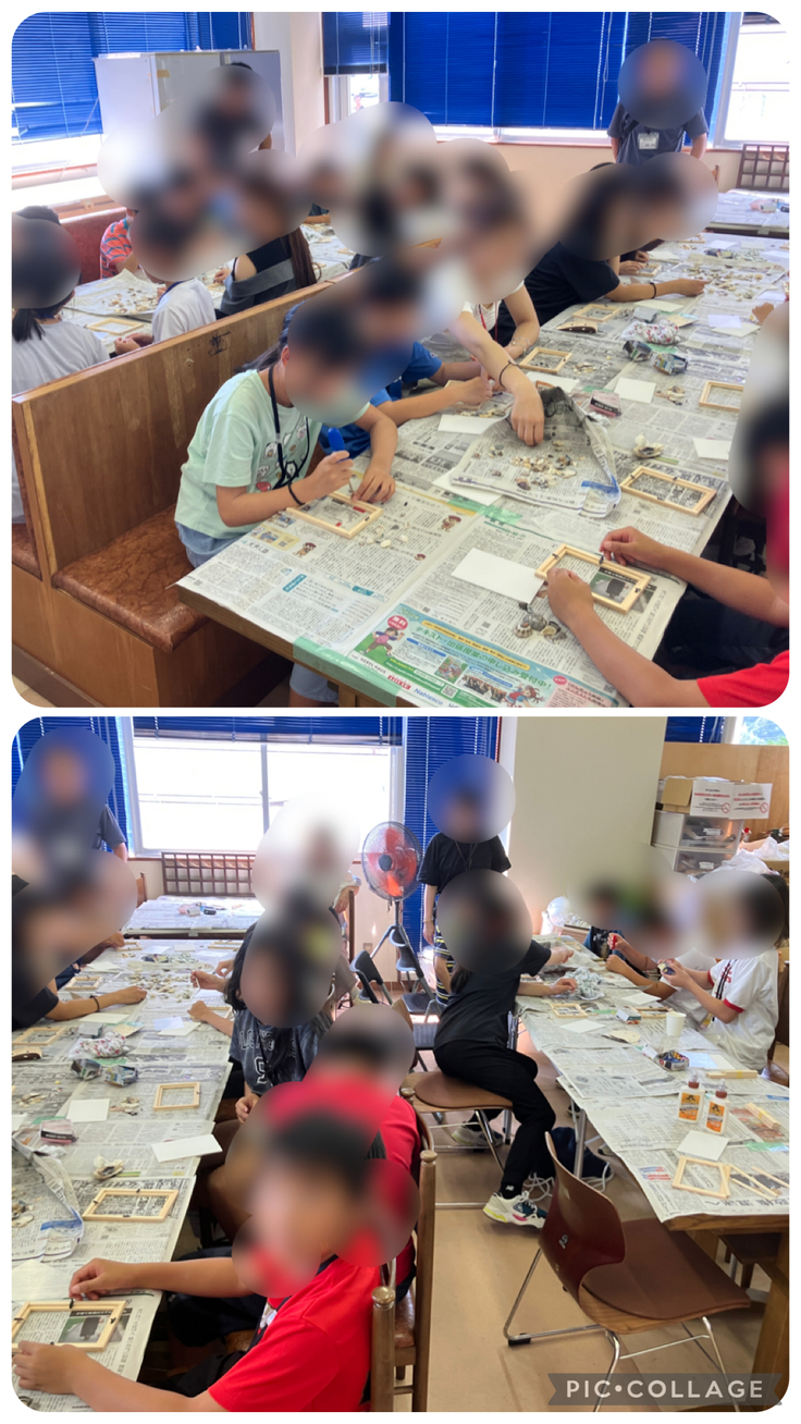 ボンドを使って組み立て、白浜の貝殻やチャーム、カラーペンなどで飾りつけをしました。