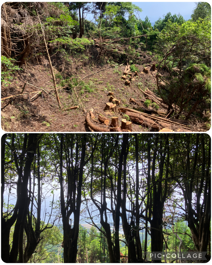 一部ですが、最下段から山頂までの伐採も完了しています。9月は伐採木の処理と植栽に向けた地拵えを中心に行なっていきたいと思います。