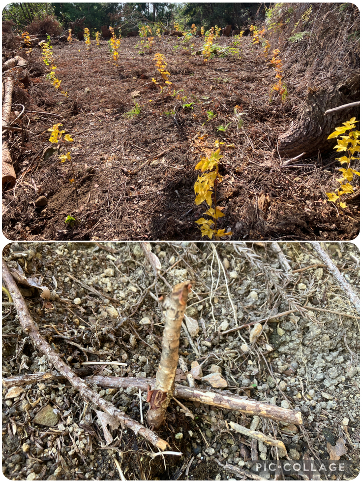 ⑤何とか地拵えも間に合わせつつ、10月末にはイタヤカエデを200本植樹することができました。すでに紅葉しかけておりとても鮮やかできれいでした。将来的には樹皮が工芸品の材料となり、樹液からはメープルシロップが抽出できる優良な木です。うまく育ってくれることを願います。