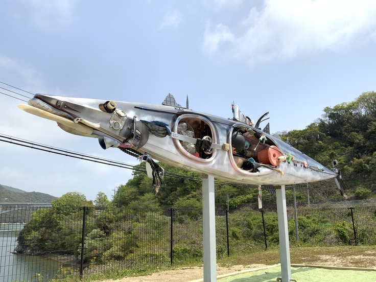 この作品では、壊れたカヤックを体に見立て、海ゴミをもう一度蘇らせました。