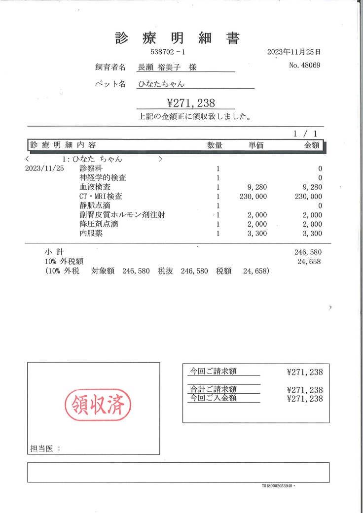 愛犬ひなたの環軸椎亜脱臼の手術、入院費