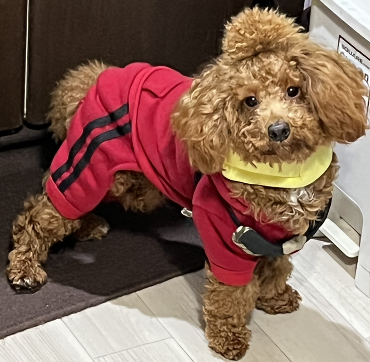トリミングに行けないので、自然アフロ犬みたいになってしまったので少し髪の毛縛ってみたりしてますか😊