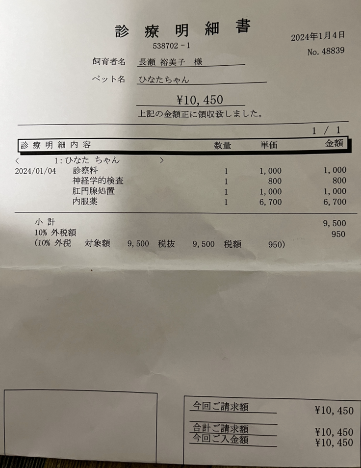 今回の診察代と薬代です。