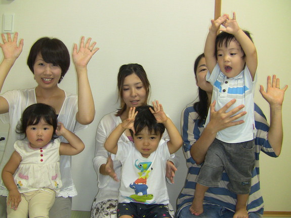 (「トミックがはじまるよ」の曲に合わせて体を動かす親子)