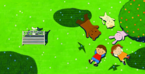 芝生の上に寝転ぶ男の子と女の子と動物達。。。