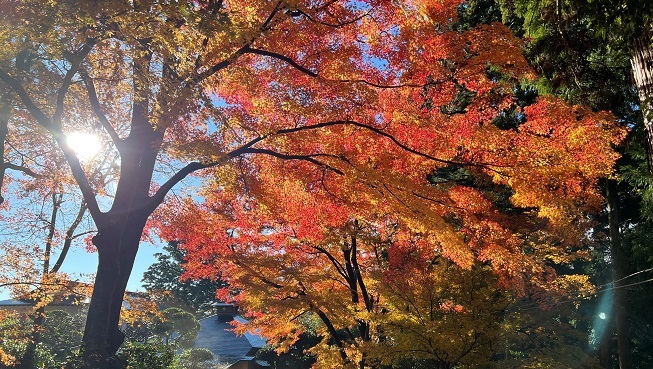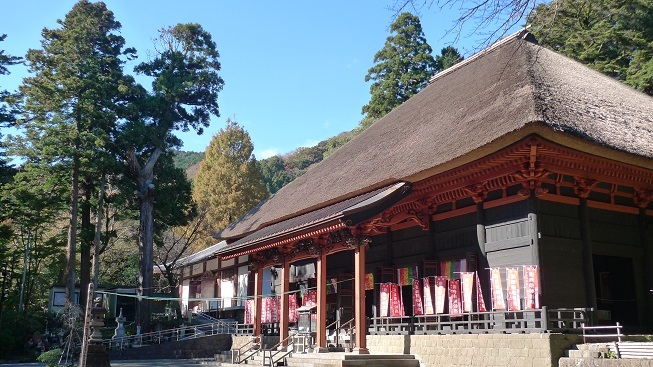 山の中腹にある当山は、日本有数の大きさを誇る茅葺き屋根の本堂が特徴です。その茅葺き屋根を風雨から守るかのように、周辺には大きな大木がそびえ立っています。先人が計算したかのように、お寺全体を自然が守ってくれているのです。