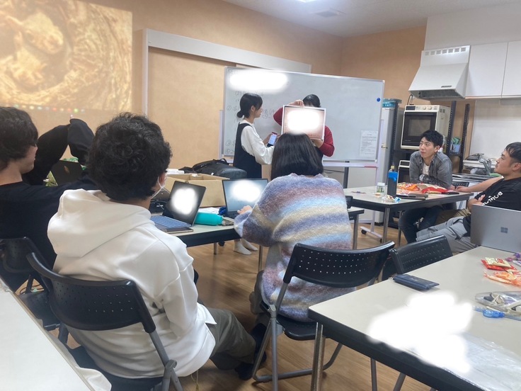 「こんな方向性で考えている」や「こっちの案とこっちの案どっちがいいかな?」、「○○らしいものって他に何があると思う?」「○○に悩んでいて、案募集!」など班をまたいでよりよくするために話し合いを行いました。