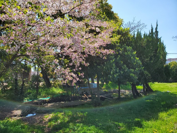写真は、ほたる池のほとりに咲く桜です。例年は入学式まで花が持たないことが多いのですが、今年はまだ咲いてくれています。子どもたちが来るのを待っているようで、胸が熱くなりました。