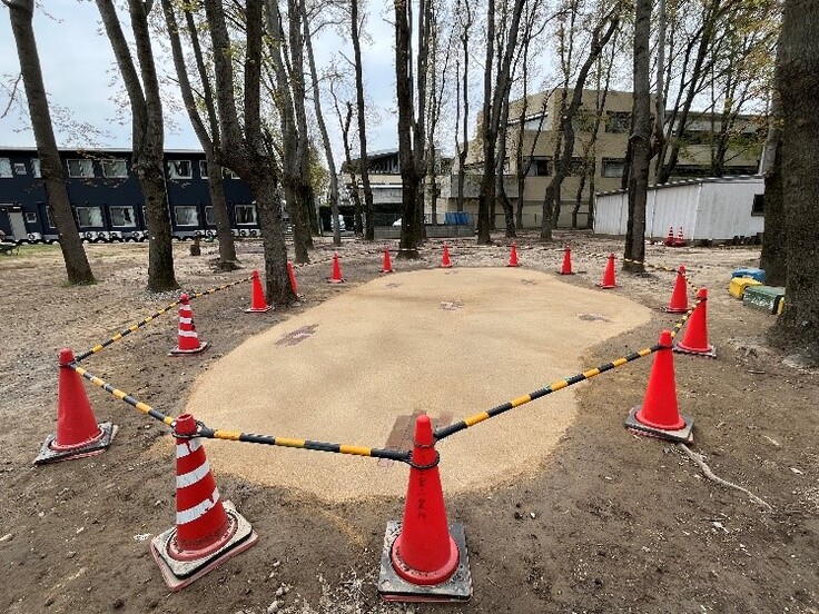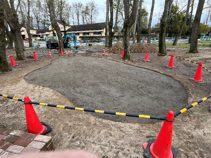 雨が降ると水たまりやぬかるみになっていた場所を「マサファルト」で舗装しました。マサファルトは、環境にやさしく透水保水性に優れた資材なので自然豊かなひらたの杜にはとてもマッチしています。