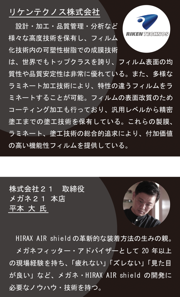 いただいたご意見を元に100回以上に及ぶ試作・改良を重ね、「平岡工業」「リケンテクノス」「メガネ21」の3社共同で高性能フェイスシールド(HIRAX AIR shield)の開発に成功しました。