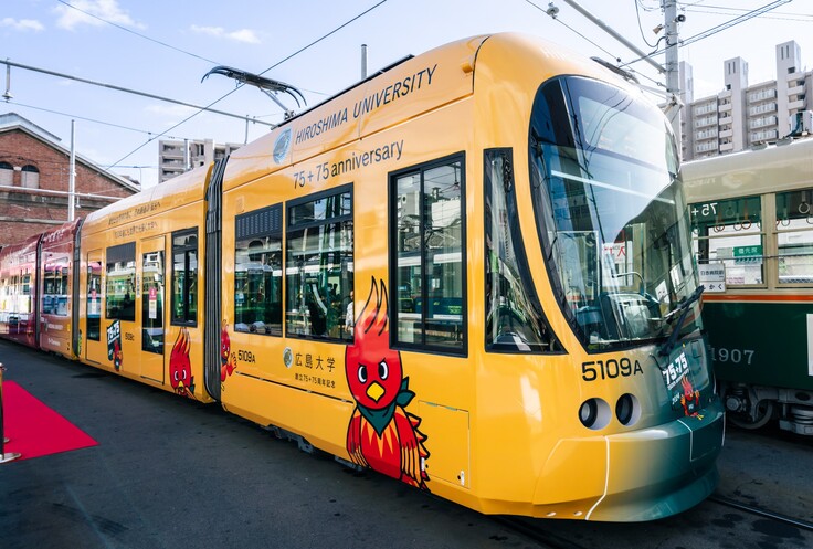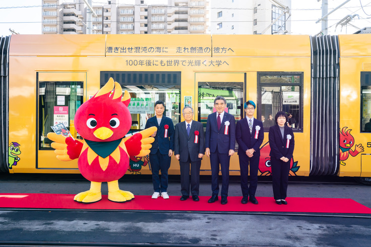 お披露目式では、広島電鉄社長で本学ご卒業生の椋田様、電車・バスのデザインに選ばれた学生の吉朝様、職員の引地様、本学マスコットキャラクターの「ひろティー」と、その生みの親であるカミガキヒロフミ様に出席頂き、盛大に執り行われました!