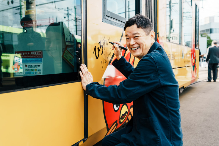 ラッピング電車には、カミガキ氏や本学学長の越智のサインも施されています!