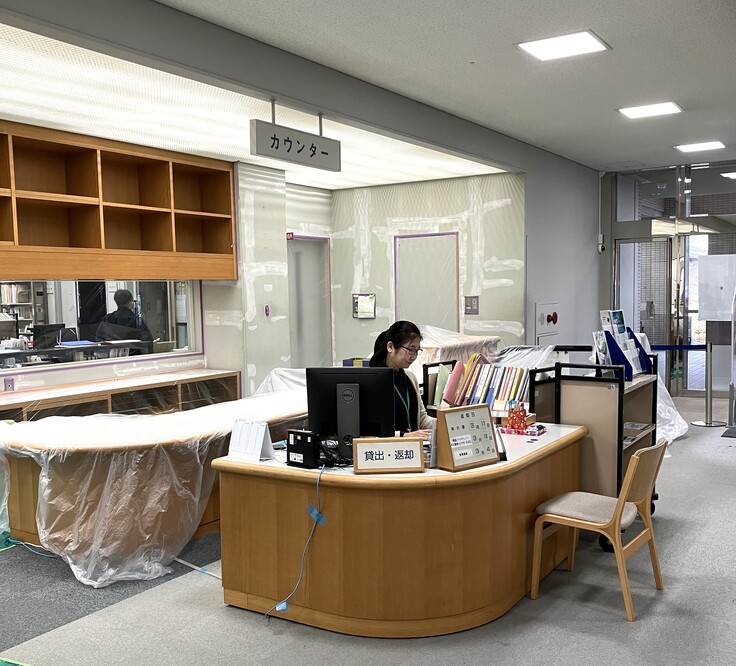 図書館を開館しながら、リニューアル工事を行っている都合上、ちょっとだけ壁から離れました。