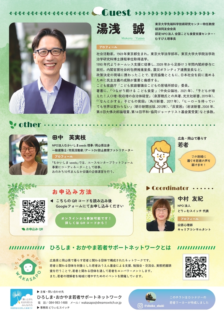 認定NPO法人 子ども食堂支援センター むすびえ 理事長の湯浅 誠さんをゲストにお呼びし、当ネットワークに参加している団体と、広島県で生活を送る当事者の若者とともに、「地域で若者の心の居場所を育て、拡げていくために何が必要か」について、交流する予定です。