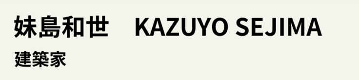 1956年生まれ。1981年日本女子大学大学院修了。1987年妹島和世建築設計事務所設立。1995年西沢立衛とSANAA 設立。現在、ミラノ工科大学教授、日本女子大学客員教授、大阪芸術大学客員教授、横浜国立大学名誉教授、東京都庭園美術館長。主な妹島和世建築設計事務所の作品に再春館製薬所女子寮、梅林の家、犬島「家 プロジェクト」、すみだ北斎美術館、日本女子大学目白キャンパスがある。