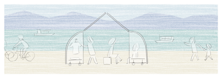 建築祭の会場のひとつである広島県尾道市の ONOMICHI U2 に隣接するウォーターフロントの⽊製デッキの空間、オリーブ広場に設置するキオスク。透明な膜材の2つの⼩さな建築による“⾵景が通り抜ける”キオスクが登場します。