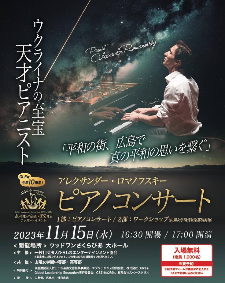 そんな、エンタメ協会が今回応援するプロジェクトは、山陽女学園の生徒さんたちが企画・運営を行う「ロマノフスキーピアノコンサート」です。山陽女学園の生徒さんたちが、平和の街広島で、平和の音を届けることを目的として今回のプロジェクトが走り始めました。