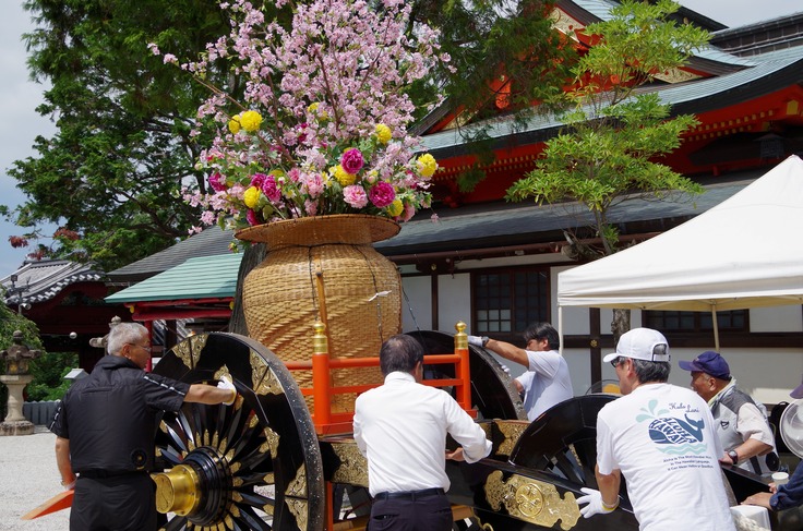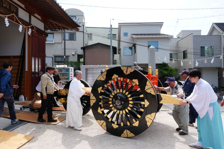 写真は神輿蔵から花車を出しているところです。