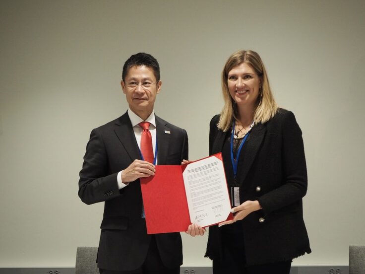 覚書を交わす湯崎英彦広島県知事(左)とICAN ベアトリス・フィン事務局長(右/当時)